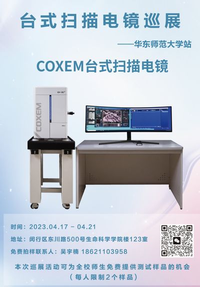为更好地服务学校科研教学工作,普及扫描电镜原理及操作常识,提高扫描电镜应用水平,公共创新服务平台电镜中心与COXEM(库赛姆)公司合作,拟于2023年4月17日-21日举办台式扫描电子显微镜应用技术交流体验活动。活动详情如下: